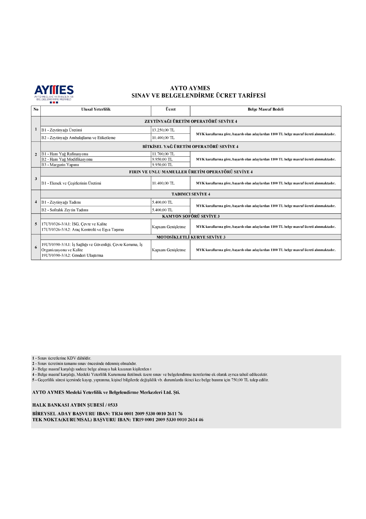NOT: Sınav sonrasında belge almaya hak kazanıldığı takdirde AYTO AYMES ’e belge ücreti ödenmektedir. Bu ücret MYK (Mesleki Yeterlilik Kurumu) tarafından belirlenmektedir.